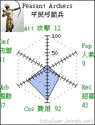 平民們通常使用弓箭進行狩獵,裝備獵弓和短刀。中世紀社會底層的民眾生活極為艱辛,因此這些入伍平民部分是由於強制應徵,部分卻出於自願,希望能夠獲得更好的生活水平。平民弓箭兵表現平平,不能寄予過高期望。