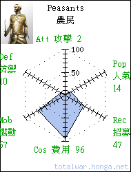 Peasants 農民 light infantry In times of war peasants are forced from their farms and drafted into levies. Good cannon fodder. 農民經常在戰時被強行徵召入 伍,充任廉價炮灰。