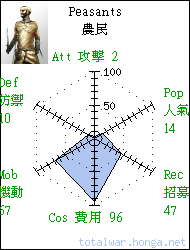 Number of turns to build, Cost of unit to construct, Cost of upkeep, Cost of upgrading weapons, Cost of upgrading armour, Cost for custom battles, Limit in custom battle, Cost for punish 徵召回合, 招募費, 維持費, 升級武器, 升級盔甲, 自訂戰役, 多於幾隊, 懲罰金額