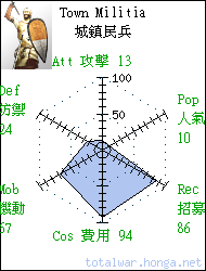 城鎮民兵不穿盔甲,使用短矛作戰。他們來自城鎮平民,應徵入伍防禦自己的家園,有時亦會外出作戰。儘管城鎮民兵防禦城邑頗為盡職,但並非精銳野戰部隊。