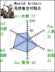 Mamluk Archers 馬穆魯克弓騎兵 missile cavalry Bought as slaves, and trained from boyhood, these formidable soldiers excel at archery, but can also hold their own in melee. 馬穆魯克弓騎兵以奴隸身份進 入埃及,自童年始即接受作戰 訓練。他們箭法如神,近戰搏 殺亦頗為出色。