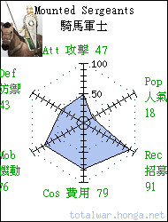 Mounted Sergeants 騎馬軍士 light cavalry These veteran warriors wear light armour and are armed with a spear and a sword. 騎馬軍士身穿輕甲,手持長矛 和利劍。