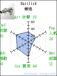 This fearsome artillery piece is the pinnacle of late Medieval siege-gun engineering. With greater range, damage and accuracy than all the siege guns that come before it, no enemy emplacements can stand up to its fearsome bombardment, nor can enemy troops withstand its explosive shots. Generals should fear the gaze of the Basilisk!