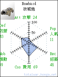Bombard 攻城炮 missile siege Primitive siege-gun forged of bronze or iron, can shoot solid stone or flaming shot. Inaccurate versus units. 攻城炮為最早的攻城火炮,炮 身由青銅或黑鐵鑄成,能發射 巨型石彈或火球,對部隊射擊 精準程度不高。