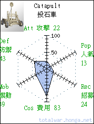 Catapult 投石車 missile siege Older style rock-flinging wooden artillery piece. Can throw flaming and normal shots. 投石車為投擲巨石的木質器械, 可投擲巨石和火球。