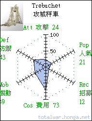 Trebuchet 攻城秤車 missile siege Giant rock flinging artillery piece. Capable of flaming and normal shot. Also able to fling diseased cows! 攻城秤車為巨型投擲攻城武器, 可投擲巨石、火球和腐爛牛屍。