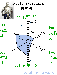 Noble Swordsmen 貴族劍士 heavy infantry Strong Scottish melee unit armed with sword and shield and wearing plate armour. 貴族劍士身穿板甲,手持長劍 和盾牌,攻防能力俱佳。