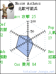 Norse Archers 北歐弓箭兵 missile infantry Armed with a bow, a sword, shield and light armour, Norse archers are weak at shooting, but can stand their ground in melee. 北歐弓箭兵裝備單體弓、長劍、 盾牌和輕甲,遠程殺傷較弱, 但近身搏殺卻頗為出色。