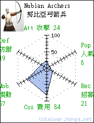 Nubian Archers 努比亞弓箭兵 missile infantry Coming from all over Africa these light troops are equipped with a bow and hand weapon. 努比亞弓箭兵是來自非洲的輕 裝步兵,裝備戰弓和格鬥武器。