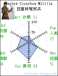 Pavise Crossbow Militia 巨盾持弩民兵 missile infantry Italian crossbow militia, armoured with mail and a pavise. 巨盾持弩民兵裝備鏈甲和全身 巨盾。