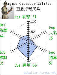 Pavise Crossbow Militia 巨盾持弩民兵 missile infantry Italian crossbow militia, armoured with mail and a pavise. 巨盾持弩民兵裝備鏈甲和全身 巨盾。