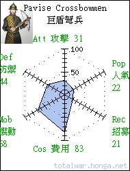 Pavise Crossbowmen 巨盾弩兵 missile infantry These troops are armed with a large shield to protect them during the slow process of reloading their crossbow. 巨盾弩兵背負全身巨盾,以防 裝填弩箭途中遭受攻擊。