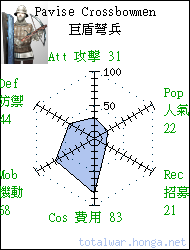Pavise Crossbowmen 巨盾弩兵 missile infantry These troops are armed with a large shield to protect them during the slow process of reloading their crossbow. 巨盾弩兵背負全身巨盾,以防 裝填弩箭途中遭受攻擊。