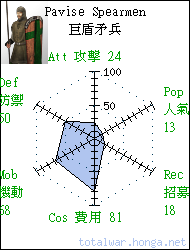 Pavise Spearmen 巨盾矛兵 spearmen infantry Lower gentry serving military duty. Wearing good armour and equipped with a spear, able to form a defensive ring of spears. 巨盾矛兵出身於匈牙利低階貴 族,作為步兵在軍中服役。他 們裝備長矛,身穿精良盔甲, 能夠以圓陣拒敵。