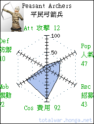 Peasant Archers 平民弓箭兵 missile infantry A peasant archer is armed with a small bow, and a knife. Unreliable, and only moderately effective as archers. 平民弓箭兵裝備獵弓和短刀, 士氣低落,只能作為遠程部隊 使用。