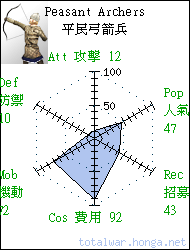 Peasant Archers 平民弓箭兵 missile infantry A peasant archer is armed with a small bow, and a knife. Unreliable, and only moderately effective as archers. 平民弓箭兵裝備獵弓和短刀, 士氣低落,只能作為遠程部隊 使用。