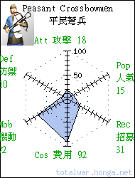 Peasant Crossbowmen 平民弩兵 missile infantry Peasant crossbowmen are armed with a crossbow, knife and if lucky enough, some armour. 平民弩兵裝備軍弩和飛刀,部 分幸運士兵尚可配備輕型鏈甲。