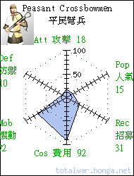 Peasant Crossbowmen 平民弩兵 missile infantry Peasant crossbowmen are armed with a crossbow, knife and if lucky enough, some armour. 平民弩兵裝備軍弩和飛刀,部 分幸運士兵尚可配備輕型鏈甲。