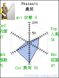 Peasants 農民 light infantry In times of war peasants are forced from their farms and drafted into levies. Good cannon fodder. 農民經常在戰時被強行徵召入 伍,充任廉價炮灰。