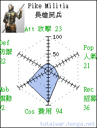 Pike Militia 長槍民兵 spearmen infantry Pike Militias range from armed peasants to semi-professional well trained and equipped soldiers. 長槍民兵含義廣泛,從簡陋裝 備的農民,到半職業精銳重裝 部隊,應有盡有。