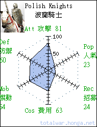 Polish Knights 波蘭騎士 heavy cavalry Well armoured and equipped, and practiced in heavy cavalry tactics these knights make a fearsome addition to any Polish army. 波蘭騎士裝備精良,精熟重騎 兵戰術,乃波蘭軍隊之殺手鑭。