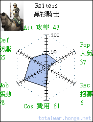 Reiters 黑衫騎士 missile cavalry Effective gunpowder units, Reiters are armed with a pistol and spear, and protected by plate armour. 黑衫騎士裝備火槍和長矛,身 穿板甲,是出色的火槍騎兵。