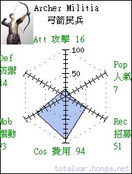 Archer Militia 弓箭民兵 missile infantry A type of trained civilian guard called, ' tzakones' responsible for protecting settlements, roads and forts. 弓箭民兵是經過訓練的城鎮守 衛武裝,負責防禦城邑、道路 和營寨。