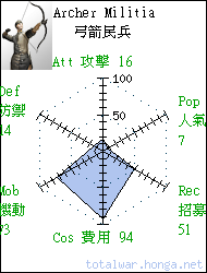 Number of turns to build, Cost of unit to construct, Cost of upkeep, Cost of upgrading weapons, Cost of upgrading armour, Cost for custom battles, Limit in custom battle, Cost for punish 徵召回合, 招募費, 維持費, 升級武器, 升級盔甲, 自訂戰役, 多於幾隊, 懲罰金額
