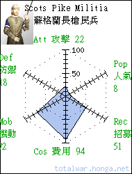 Scots Pike Militia 蘇格蘭長槍民兵 spearmen infantry Lowland Scots levied into a militia to defend their settlement. Armed with pikes for good defence against cavalry, but lacking in armour. 低地蘇格蘭平民經常被征入本 地民兵部隊防禦城邑。他們接 受過部分訓練,使用長槍,對 抗騎兵頗為出色,但是盔甲簡 陋。