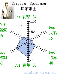 Sergeant Spearmen 長矛軍士 spearmen infantry Trained and hardened warriors, protected by a large shield, armed with spears and able to form a defensive ring of spears. 長矛軍士是訓練有素的精銳部 隊,手持巨盾和長矛,必要時 可列圓陣接敵。