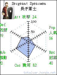 Sergeant Spearmen 長矛軍士 spearmen infantry Trained and hardened warriors, protected by a large shield, armed with spears and able to form a defensive ring of spears. 長矛軍士是訓練有素的精銳部 隊,手持巨盾和長矛,必要時 可列圓陣接敵。