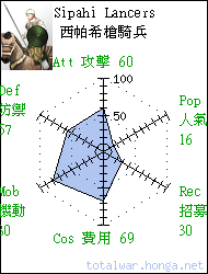 Sipahi Lancers 西帕希槍騎兵 heavy cavalry A better class of Sipahis, better suited to hand to hand combat than their archers counterparts. 槍騎兵為西帕希部隊精銳,與 弓騎兵同儕相比,更為擅長近 身搏殺。