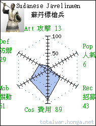 蘇丹標槍兵來自撒哈拉南部的非洲土地,以當地傳統戰術風格進行作戰。他們輕裝上陣,以如雨標槍殺傷敵軍。這種輕裝部隊遠程殺傷和破壞敵軍陣型非常出色,近戰肉搏則極為脆弱。