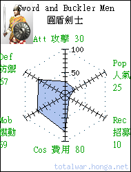 Sword and Buckler Men 圓盾劍士 light infantry Superior swordsmen wearing light armour and an open helmet, and armed with a double-edged sword and buckler. 圓盾劍士皆輕甲簡盔,裝備金 屬圓盾和鋒利托萊多雙刃長劍。
