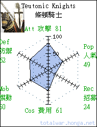 Teutonic Knights 條頓騎士 heavy cavalry Ruthless Germanic knightly order, well armoured with lances and large maces, these knights love a good melee. 條頓騎士團是作風冷酷的德意 志騎士團體,裝備騎槍和大型 狼牙棒,熱衷近身肉搏廝殺。