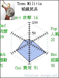 Town Militia 城鎮民兵 light infantry Town Militia are commoners and peasants levied into local militias to defend settlements and bolster armies, armed with short spears. 城鎮民兵不穿盔甲,使用短矛 作戰。他們來自城鎮平民,應 征入伍防禦自己的家園,有時 亦會外出作戰。