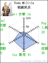 Town Militia 城鎮民兵 light infantry Town Militia are commoners and peasants levied into local militias to defend settlements and bolster armies, armed with short spears. 城鎮民兵不穿盔甲,使用短矛 作戰。他們來自城鎮平民,應 征入伍防禦自己的家園,有時 亦會外出作戰。