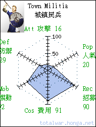 Town Militia 城鎮民兵 light infantry Town Militia are commoners and peasants levied into local militias to defend settlements and bolster armies, armed with short spears. 城鎮民兵不穿盔甲,使用短矛 作戰。他們來自城鎮平民,應 征入伍防禦自己的家園,有時 亦會外出作戰。