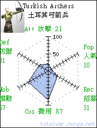 Turkish Archers 土耳其弓箭兵 missile infantry Used to hunting with a bow these troops are proficient with their bows, but will melt away quickly in melee. 土耳其弓箭兵入伍前以使用弓 箭狩獵為生,因此箭法出色, 但近身肉搏頗為脆弱。