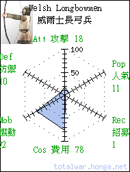 作為長弓的始作俑者,威爾士人使用這種武器技藝嫻熟。由於土地貧瘠,他們紛紛加入外國軍隊以求財富和冒險經歷。長弓兵們近戰薄弱,但遠程殺傷極為恐怖。作戰時他們會在陣前設置拒馬尖樁,令敵軍騎兵望而生畏。