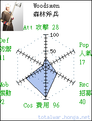 Woodsmen 森林斧兵 light infantry Hardy folk from the forests of North Eastern Europe, armed with a large axe. 森林斧兵是來自東北歐黑森林 中的強悍戰士,揮動巨斧狂砍 猛劈。