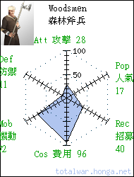 森林斧兵是來自東北歐黑森林中的強悍戰士,惡劣生存環境造就其堅韌性格。他們經常與志同道合之輩並肩作戰,保護家園和人民。斧兵們揮動傳統巨斧,將輕裝部隊砍殺得潰不成軍,即便面對重裝敵軍,亦同樣傲然無懼。一旦進入森林地區,斧兵伏擊將極為致命。