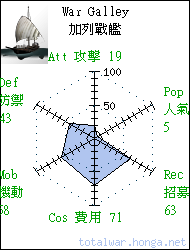 War Galley 加列戰艦 light ship War Galleys are larger than normal galleys. Equipped with ballista or catapults. 加列戰艦比戰船更為巨大,上 置弩炮或投石器。